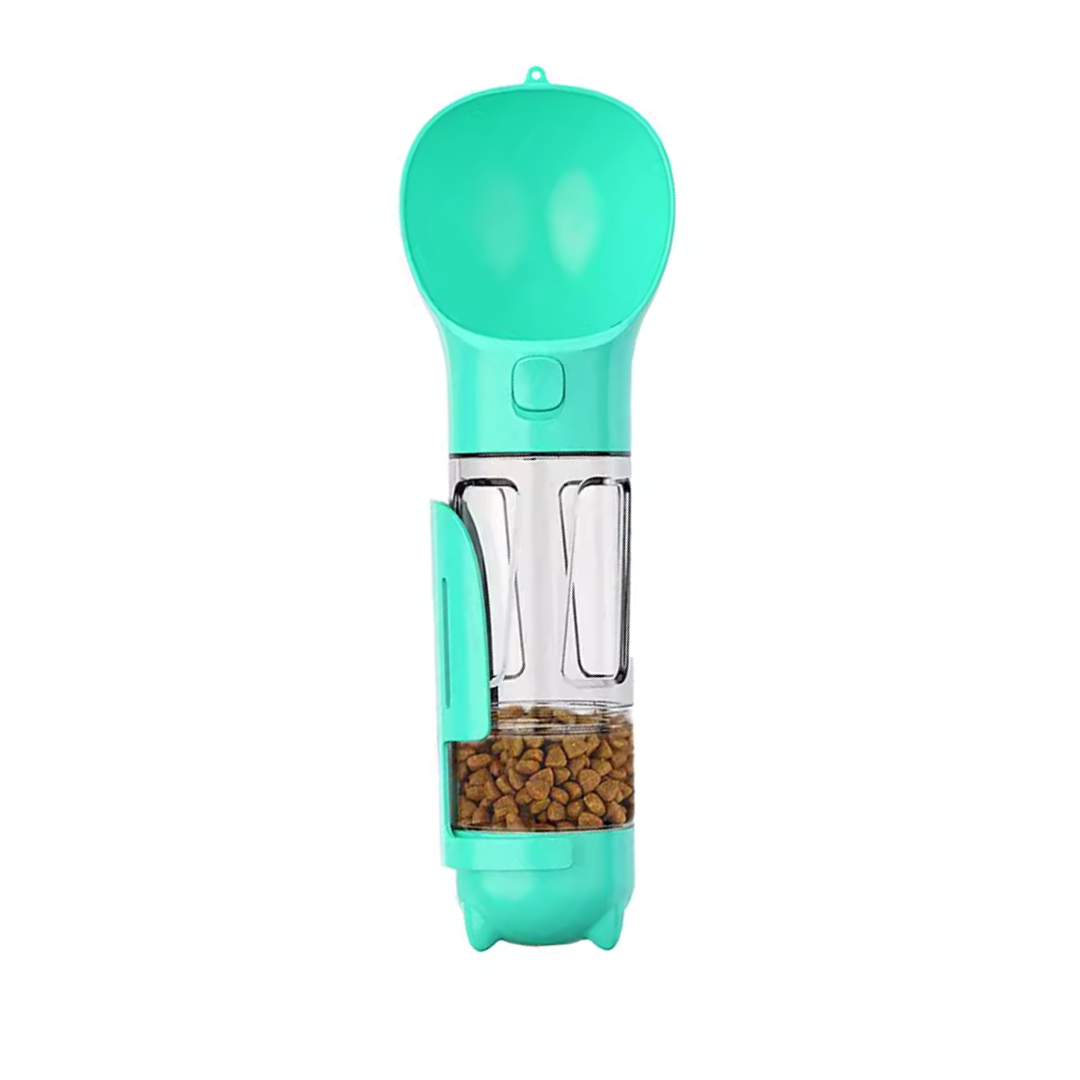 Den bärbara 4-i-1 multifunktionella vattenflaskan för hund och katt i turkos är en praktisk och genomtänkt följeslagare för alla äventyr med ditt husdjur. Med en kapacitet på 300 ml erbjuder den färskt vatten på ett läckagesäkert sätt, samtidigt som den har plats för både husdjursmat och en smart förvaring för avfallspåsar och en inbyggd skyffel. Allt för att göra promenader och utflykter enklare och mer bekväma.