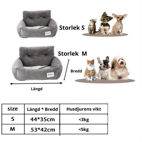 Vårt bilsäte är designat med omtanke för de minsta medlemmarna i familjen – dina husdjur. Med en vadderad och omslutande konstruktion erbjuder sätet både komfort och säkerhet under bilresan. Den mindre modellen (S) är utrustad med en säkerhetsrem, medan den större modellen (M) har två – perfekt när du reser med fler än en fyrbent vän.