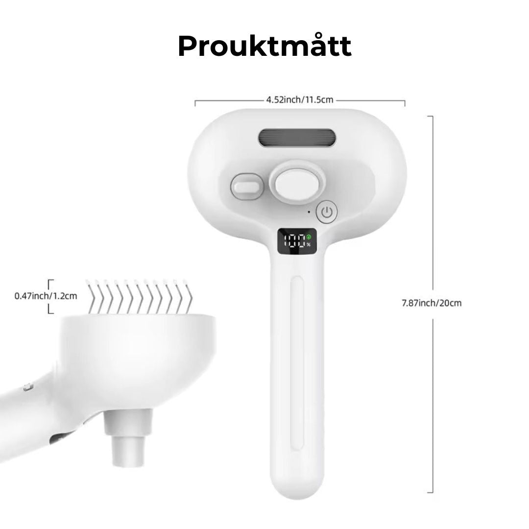Vår ångborste är dessutom enkel att använda. Ett knapptryck frigör hår från borsten, och det genomskinliga vattenfönstret låter dig se när det är dags att fylla på. Den eleganta vita designen ger en lyxig känsla i vardagen – ett perfekt val för medvetna husdjursägare som vill ha både resultat och stil.