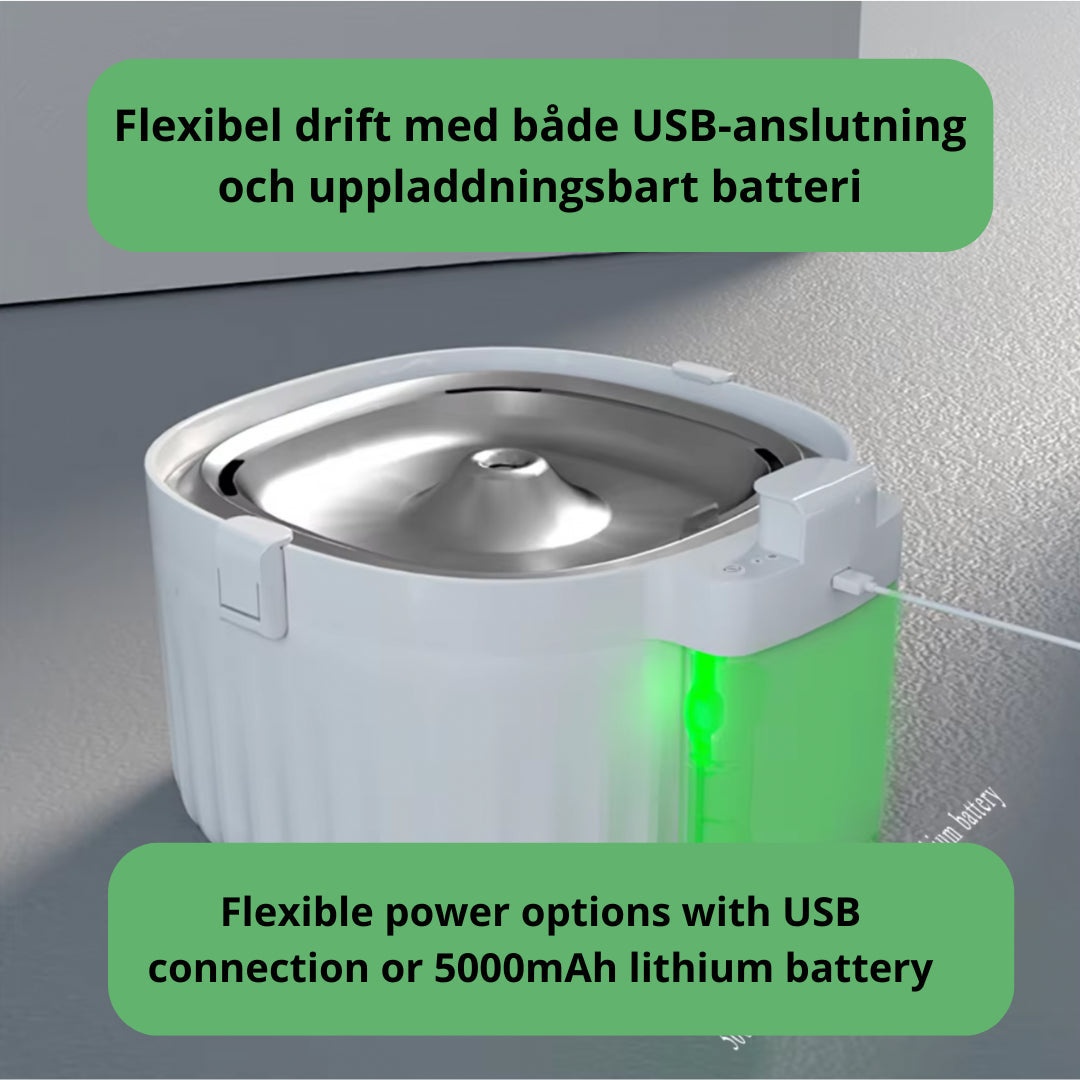 Fontänen aktiveras automatiskt med hjälp av en rörelsesensor och har ett kraftfullt uppladdningsbart batteri som räcker upp till 60 dagar i Intelligent Mode. Välj mellan trådlös drift eller fast strömkälla och få full flexibilitet både inne och ute. Den tydliga indikatorn visar när det är dags att fylla på vatten, och designen i rostfritt stål och ABS-plast gör rengöring enkel.