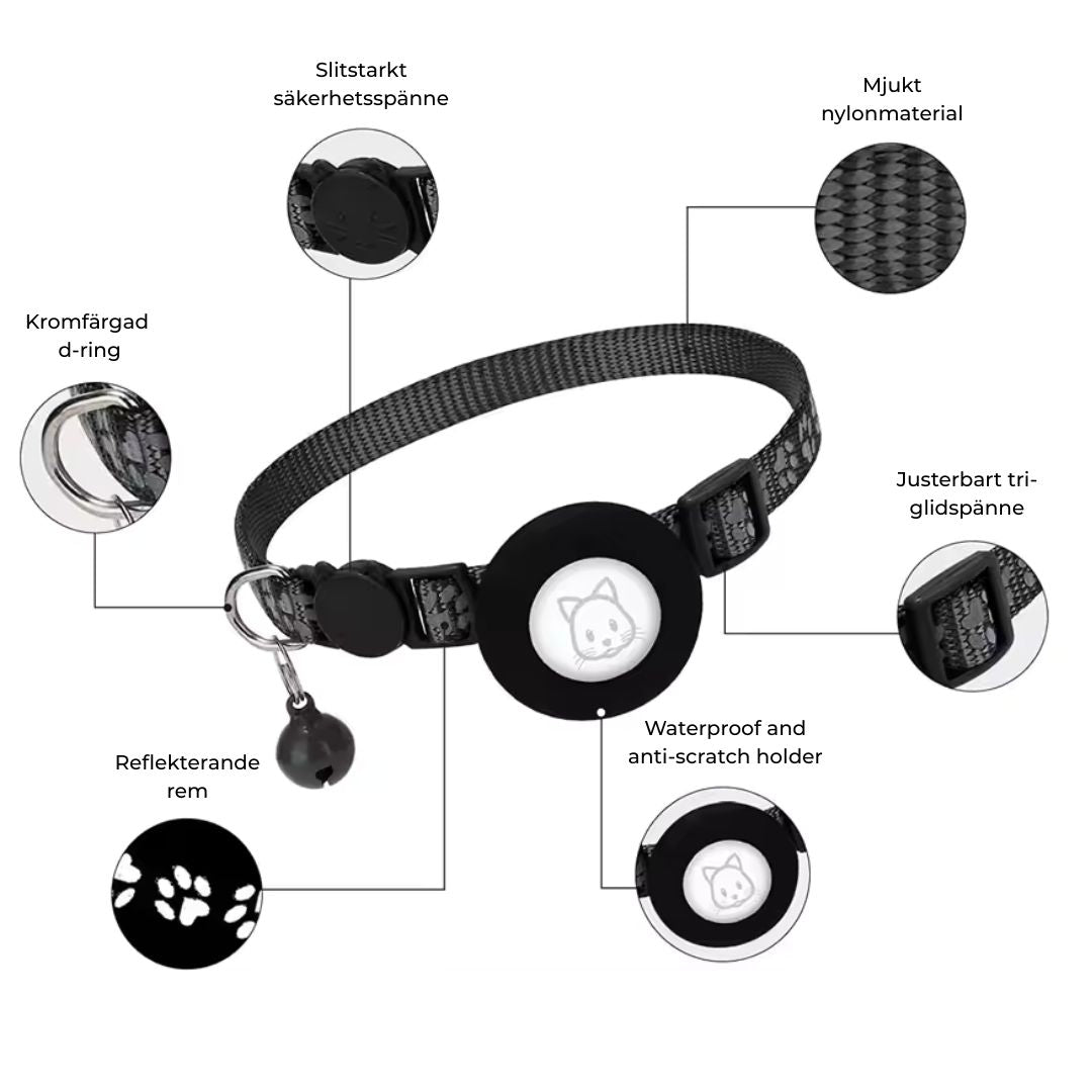 Den anpassningsbara one size-designen passar alla katter, och de reflekterande detaljerna ökar synligheten i mörker, vilket ger extra skydd mot olyckor. En liten ringklocka gör det lätt att höra när katten är nära, och det vattentäta Airtagskalet håller din Apple AirTag säker under alla väderförhållanden.