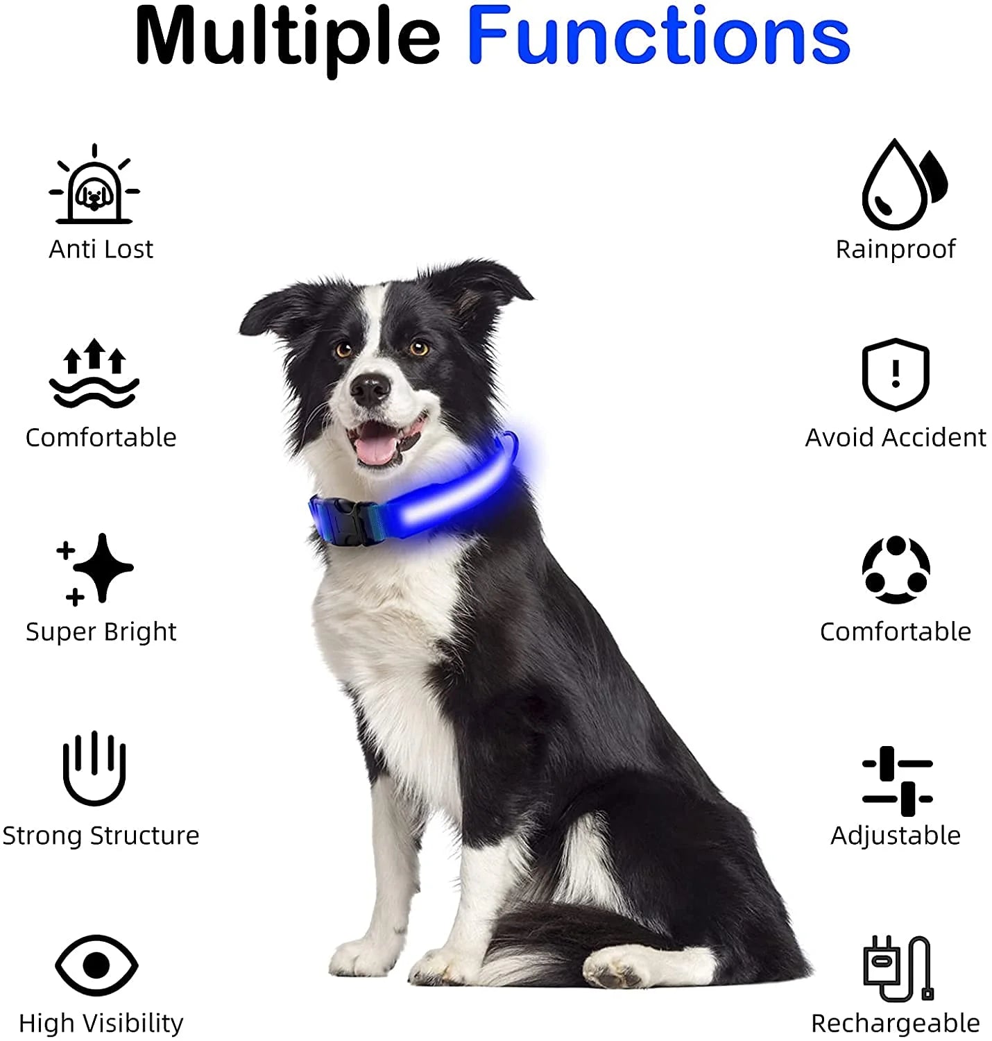 Halsbandet är justerbart och passar både hundar och katter. Det är utrustat med stark LED-belysning som syns upp till 500 meter bort, vilket gör att djuret både syns för trafikanter och blir enklare att hitta om det rymmer. Ljuset kan anpassas med olika lägen – stilla sken, långsam blinkning eller snabb blinkning – för att passa olika miljöer och tider på dygnet.