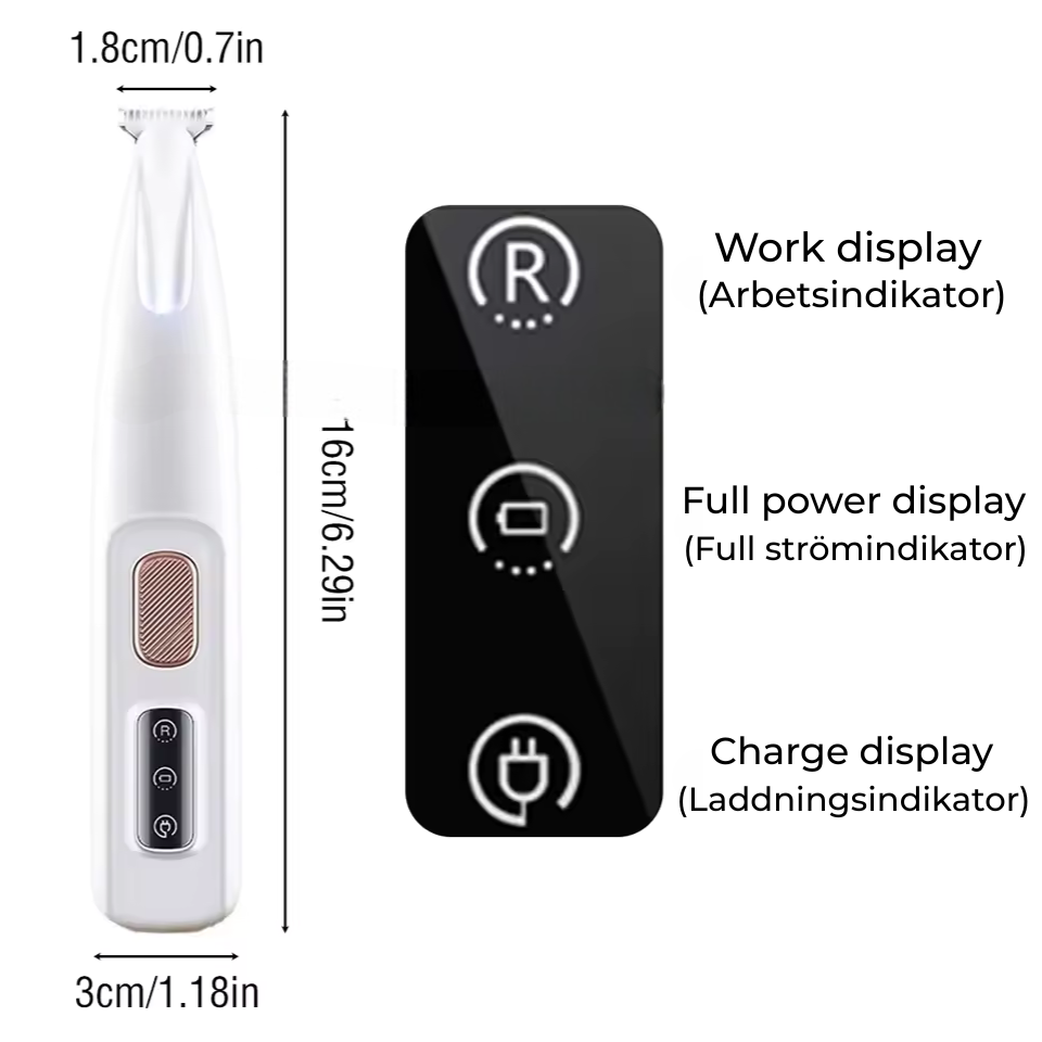 En precisionstrimmer för att forma och trimma päls runt tassar, öron och ögon på hundar och katter. Den tysta motorn på 35 dB gör användningen behaglig även för ljudkänsliga husdjur. Med ett 18 mm blad och kompakt design kommer du enkelt åt svåråtkomliga områden utan att dra i pälsen. Trimmern är uppladdningsbar med upp till 2 timmars driftstid och har en inbyggd LED-lampa för bättre sikt vid trimning. Passar både hemma och på resan.