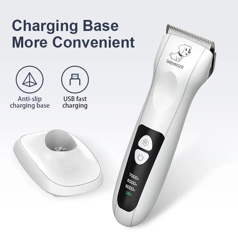 SMEHNSER T2B är en tystgående groomingtrimmer som med en ljudnivå under 60 dB skapar en lugn och trygg miljö vid varje klippning, vilket är särskilt uppskattat av känsliga husdjur. Den kraftfulla motorn klarar tät päls utan att fastna eller rycka. Trimmern har ett inbyggt 2200 mAh litiumjonbatteri som ger upp till fyra timmars kontinuerlig användning och laddas fullt på cirka tre timmar, vilket gör groomingpasset enkelt och oavbrutet.